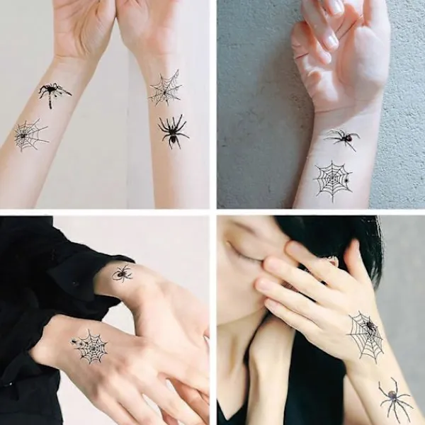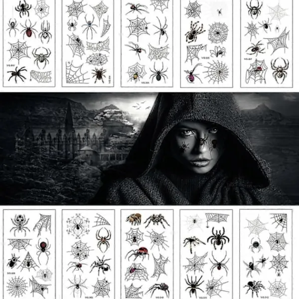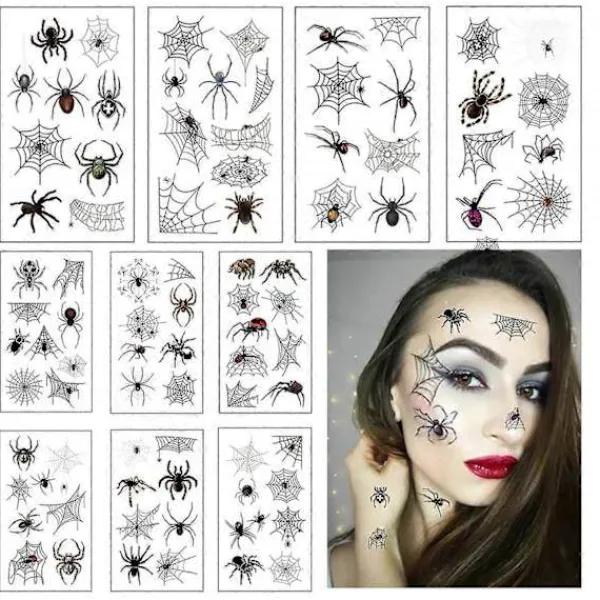 Mångsidiga Halloween-tillbehör: Dessa spindeltatueringar är inte bara för ansikten; de kan appliceras på armar, ben eller någon annan del av kroppen för en komplett Halloween-kostym. De är idealiska för häxsmink, läskiga kostymer och för att lägga till ett extra lager av Halloween-kul till din look.