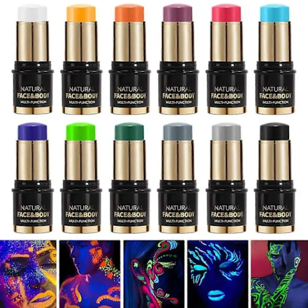 [Vattentät Ansikts- och Kroppsmålning]: 12 Färger Ansikts- och kroppsmålningsstift med en matt krämig formula. Appliceras smidigt. Lätt att blanda. Inga sprickor eller flagor. Ingen blekning. Inga fläckar eller ojämnheter. Inga fläckar och vattentät. [Vegansk & Cruelty-free & Icke-toxisk]: Tillverkad av icke-toxiska, miljövänliga ingredienser. Lämplig för alla typer av hud. Irriterar inte huden. Observera: Som med alla kosmetika rekommenderar vi att ett litet hudplåstertest görs innan applicering eftersom allas hud är olika. [Lätt att Applicera och Ta Bort]: Rotera bara ut den och måla den på din hud. Den är lätt att blanda och mixa med andra färger. OBS: Den är svår att torka, så om du använder den på kroppen eller någonstans den kommer att beröras, rekommenderar vi starkt att du använder ett fixeringspuder eller fixeringsspray för att försegla den. Lätt att ta bort med sminkborttagaren. [Idealisk för Många Tillfällen]: Perfekt för specialeffektsmink och för att skapa karaktärer som goter, vampyrer, clowner, mimer, zombies och så vidare. Ett måste för Halloweenfest, festivaler.