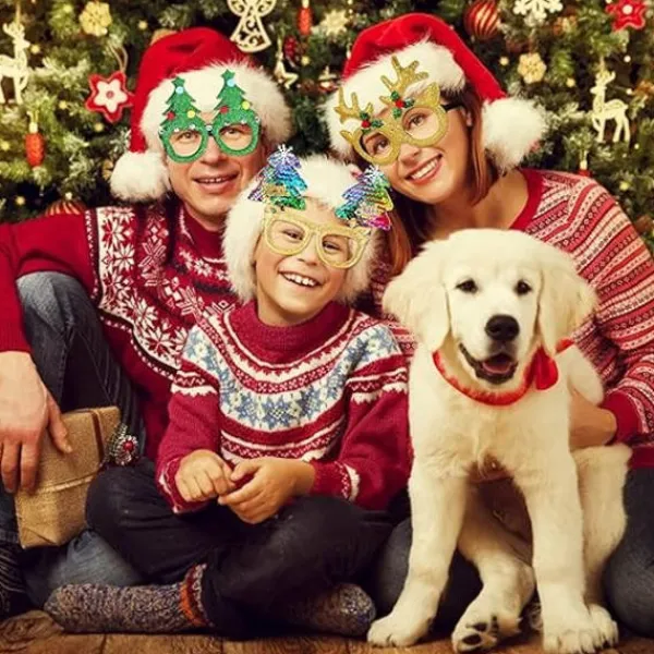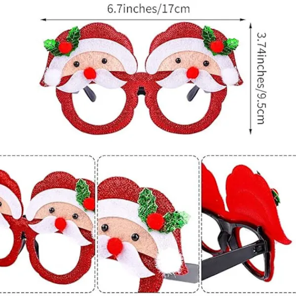 Mångfald av stilar: Våra julglasögon har olika stilar, inklusive julbåge, julhatt, snögubbe, julgran, älghorn, etc; Varje par skor har glitterpulver, vilket gör att du lyser i ljuset och sticker ut på festen.