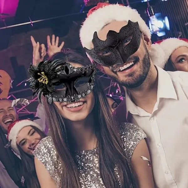 Paketet innehåller – 2 st maskeraddräkter för par, den svarta plastmasken för män, den elektropläterade svarta plastmasken för kvinnor med spetskant, strass och blomdekoration.