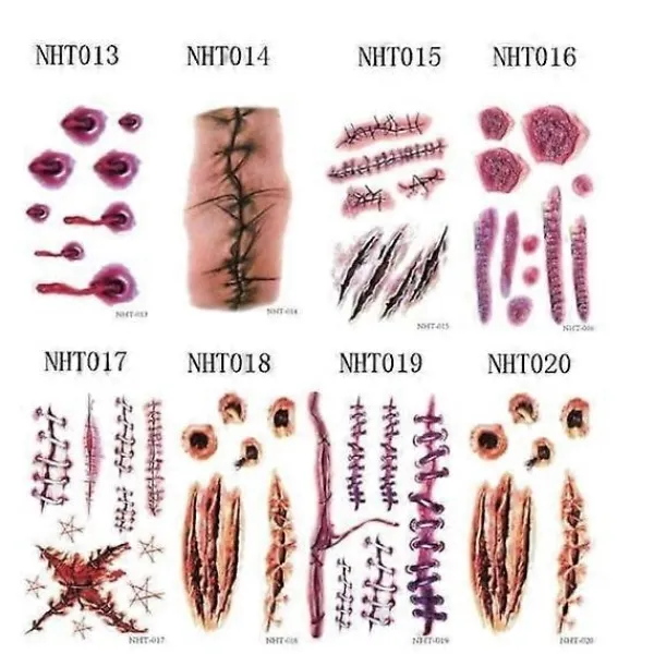 Otäcka engångstatueringar i form av diverse blodiga sår och fläkskador som ger din hemska look det där lilla extra för kvällen.
