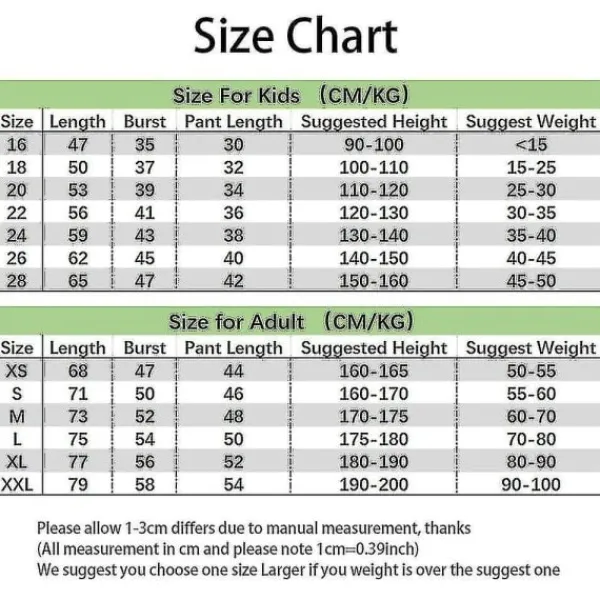 Material: Polyester Storlek: 20 22 24 26 28 XS S M L XL XXL Paketets innehåll: T-shirt + Shorts + Strumpor Rengöringsmetod: 1. Använd inte kemiska vätskor för att rengöra kläder 2. Vattentemperaturen för att tvätta kläder bör inte överstiga 30 grader Celsius 3. Handtvätt, använd inte tvättmaskin för rengöring Obs: 1. Vänligen tillåt 1-3 cm skillnad på grund av manuell mätning. 2. På grund av skillnader i olika datorskärmar kanske bilden inte återspeglar den faktiska färgen på föremålet. Vi garanterar att stilen är densamma som visas på bilden.
