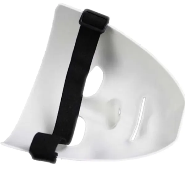 Masken är tillverkad av slitstark plast och har ett elastiskt band för att sitta bekvämt.