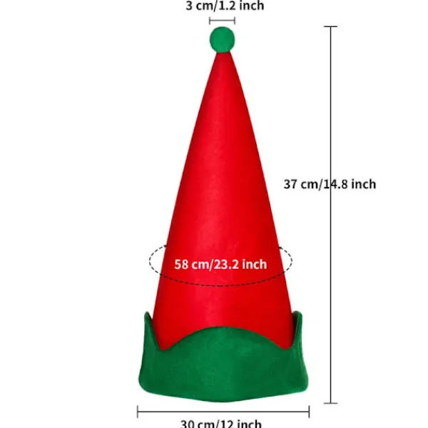 En storlek passar de flesta: Längden på tomtehatten är ca 37 cm/14,8″, bredden är ca 30 cm/12″, omkretsen är 58 cm/23,2″, topphåret är 3 cm/1,2″ i diameter, en storlek passar de flesta tonåringar och vuxna