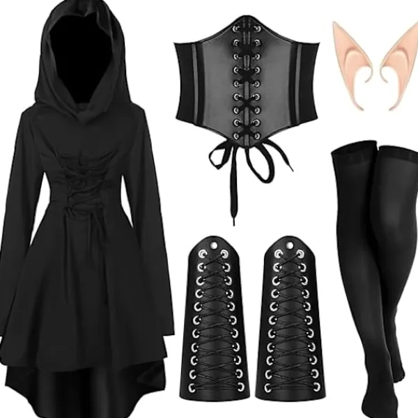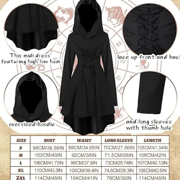 Charmig klänning med huva: Denna medeltida huvförsedda mantel har en hög-låg fåll, knytband fram och bak, en huva och långa ärmar med tumhål. Tillverkad av polyester och spandex, den är bekväm och behaglig. Knytdesignen smickrar din figur och ger en touch av elegans. Huvan ger klänningen en touch av mystik, vilket gör den perfekt för Halloween och cosplay.