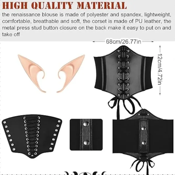 Storlek: Dessa älvöron för kvinnor mäter cirka 12 cm och är gjorda av latex, så du kan bära dem direkt över öronen utan obehag. De kan kombineras med de flesta klädstilar för att göra din outfit mer realistisk. Bältet är cirka 68 cm långt och 12 cm brett, och det mycket elastiska bältet passar de flesta kvinnor.