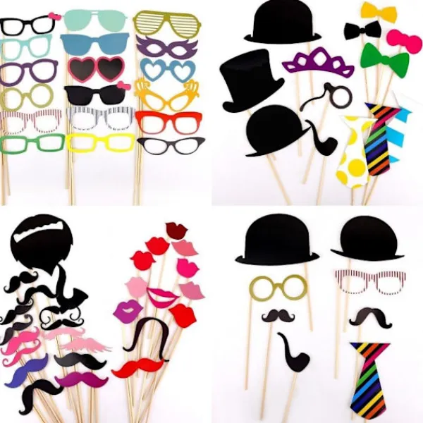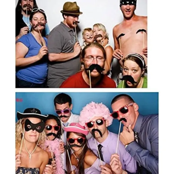 Detta set innehåller 58 olika delar, såsom glasögon, läppar, slipsar och hattar. Perfekt för alla dina foton med familj och vänner. Dessa masker kommer att ge timmar av skoj på fester, bröllop och fotograferingar. En rolig mustaschmask för bröllop, fester och jul. En perfekt festgåva för utklädningslekar och firanden.