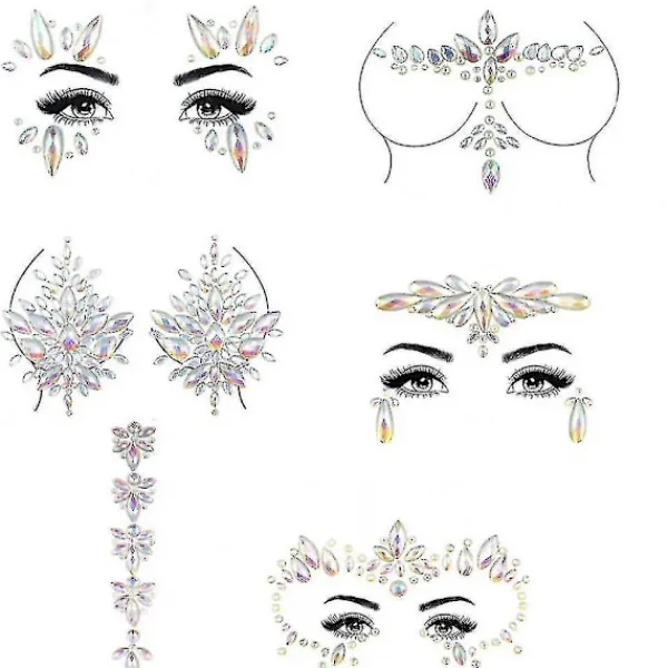 6 ark Noctilucent Rhinestone Face Sticker Självhäftande Crystal Body Gems för hud ansikte kroppskonst. Lätt att applicera, bara skala och klistra. Inget behov av att limma användningen av bekväm och snabb. Avtagbar, omplacerbar, återanvändbar. Lys upp direkt var du vill. Placera dina ädelstenar över hela ansiktet och kroppen; panna, ögonbryn, kinder, runt ögonen, mage, bröst, rygg, armar, händer och till och med håret Bär dem som en bindi. Dessa ansiktsjuveler kan kasta starkt ljus även om det är helt mörkt. Vänligen belys dessa kroppssmycken under ljus eller solljus innan du använder dem, det kommer att göra att smyckena lyser på natten.