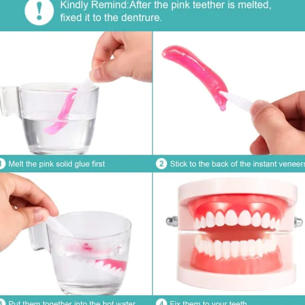 Lätt att bära: Först måste du blötlägga den kosmetiska tandskyddet i varmt vatten på cirka 130 grader Celsius, termoplastiskt fixeringsmaterial (ingår) blir mjukare, sedan kan du bara bära det på ditt övre tandkött, tryck på det tills monteringsmaterialet svalnar; Du kommer att ha vackra tänder och le självsäkert utan att gå till tandläkaren