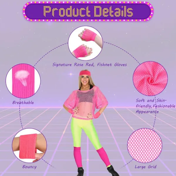 💕【Trendig ljus stil】Detta 80-tals tillbehörssats hjälper retro-trendälskare att återvända till 1980-talet. Den ljusa färgen och den eleganta dekorationen gör att du ser ljus och attraktiv ut, så vänner kan enkelt hitta dig när det är många människor där, du kommer att vara mer iögonfallande på 80-tals retro-trendfester och öka glädjen i sammankomster eller sporter.