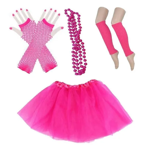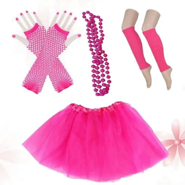 Beskrivning De har bra elasticitet och passar de flesta kroppsformer. Handskar, benvärmare, tyllkjol och halsband. Bekväma att bära och röra vid, med bra elasticitet, en storlek passar de flesta. Perfekt för 80-talsfester, fina och färgglada accessoarer. Funktioner – Färg: Rosy.- Material: Plast och spets.- Paketstorlek: 25x22x3cm.- Paketet innehåller: 1 par fingerlösa handskar, 1 par benvärmare, 1 st halsband och 1 st tyllkjol, uppfyller dina krav på en 80-tals kostymtillbehör.- Material: Handskar, benvärmare och tyllkjol är gjorda av spetstyg, plasthalsband.- Funktioner: dessa 4 typer av tillbehör finns i ett set, en storlek passar de flesta, en bra och passande outfit matchad för temafest.- Perfekt för 70-80-talsfest, halloweenutklädnad, dansshow, ett disco, maskeradfester, gotisk temafest, cosplay-tillbehör.- Visa din skönhet på fest med dina vänner: Roliga tillbehör som festgåvor för en rolig överraskning! Packlista: 1 x Halsband1 x Par Handskar1 x Par Benvärmare1 x Tyllkjol