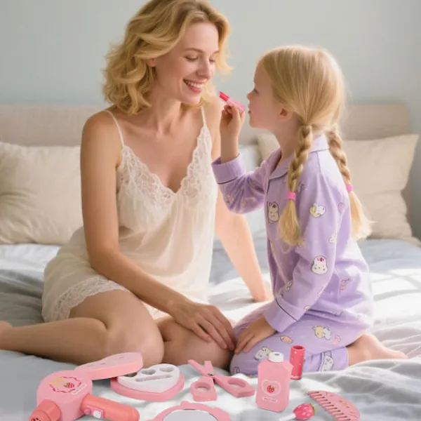 Detta högkvalitativa sminkset innehåller allt för kreativ lek: läppstift, parfym, kam, nagellack, locktång, puderborste, ögonskuggepalett, hårfön, sax, spegel och hårklippare. Perfekt för att utveckla barnets fantasi och sminkfärdigheter.