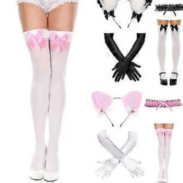 Varje set med kattkvinna-utklädningskläder kommer med 1 st Katöron Hårband, 1 st Spetskrage Halsband, 1 st Långa Handskar och 1 st Knähöga Strumpor med Rosett.