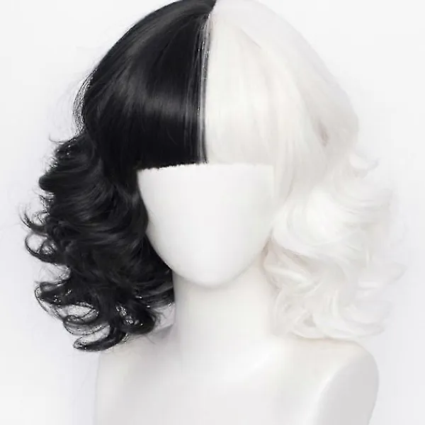 Cruella De Vil Cosplay Peruk Halv Svart och Vit för Kvinnor Cosplay Tillbehör, Kort Vågig Bob Halloween Party Peruker med Lugg