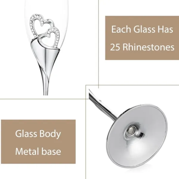 Paketet innehåller: Set med två. Detta champagneglas är ungefär 26 cm/10,2 tum högt, med en basdiameter på ungefär 6,3 cm/2,5 tum bred. Den perfekta presenten: Letar du efter en unik bröllopspresent till bruden och brudgummen? Våra champagneglas är utan tvekan ditt bästa val! Våra champagneglas består av en glaskropp och en silvermetallbas. Varje glas är inlagt med 25 strassstenar, som glittrar var de än placeras. Premiummaterial: Det handgjorda glaset är tillverkat av livsmedelsklassat material. Metallbasen är tillräckligt tung för att motstå att välta, vilket gör den säker för alla att använda. Säker förpackning: Vi packar champagneglasen i en anpassad låda och sätter in dem i det solida spåret för att säkerställa att de kommer fram säkert. Användning: Champagneglas används för catering, matservering, bröllop, bufféer, födelsedagar, fester, barer, familjesammankomster och alla andra evenemang. De är också lämpliga för jul, Thanksgiving, Alla hjärtans dag, påsk, nyår, Hanukkah, vardagsbruk och andra speciella helgdagar.