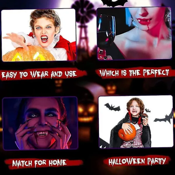 Tillämpliga TillfällenDessa vampyrtänder är lätta att bära och använda, de kan inte bara användas i det dagliga livet, utan också lämpliga för Halloween-fester, maskerader, kostymcosplays och så vidare, för att matcha dina vampyrkläder och imponera på andra på festen.