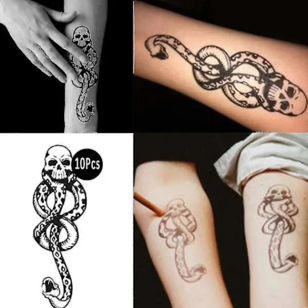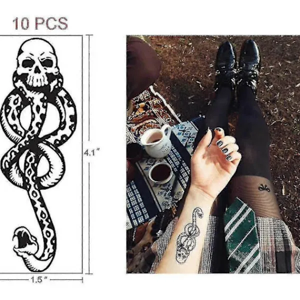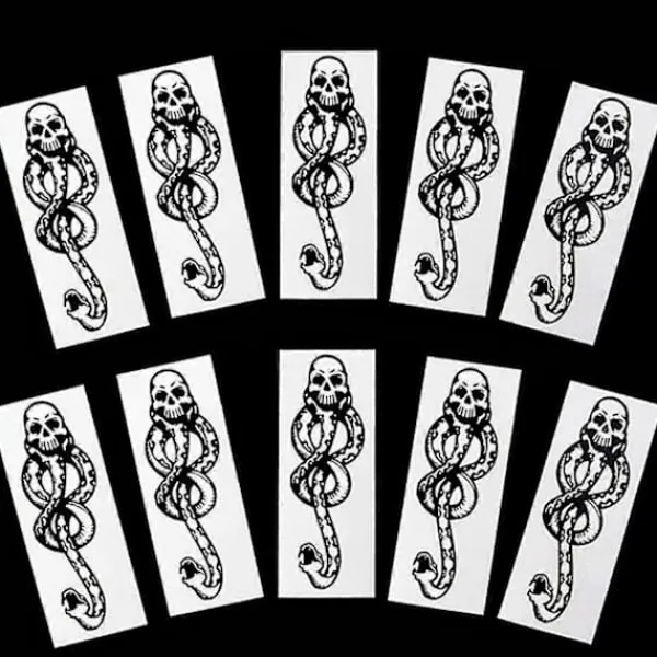 Be the first to review “Förpackning med 10 Magiska Förbannade Ormskalle Svart Etikett Dödsätare Temporära Tatueringar> Smink” Avbryt svar