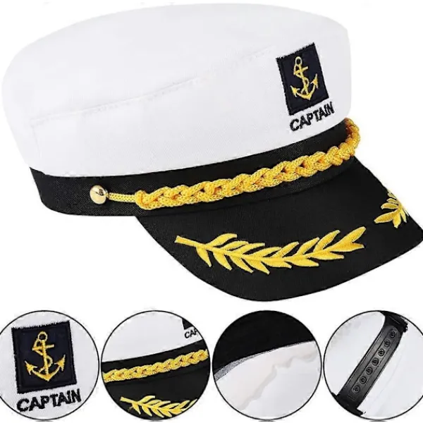 JUSTERBAR – Justerbar storlek vilket innebär att den har ett kardborreband och passar de flesta huvuden av genomsnittlig storlek. Perfekt för maskeraddräkter eller svensexa/möhippa-accessoar. Justerbar omkrets för enkel användning.UNIK DESIGN – Denna vita flottans kaptenshatt är perfekt eftersom den ger en rolig look med ett broderat guldaktigt ankar-märke. Karakteristiskt och utsökt utförande med kaptensdesign, den typiska yachtkaptensmössan.PERFEKT FÖR ALLA – Unisex vit snapback-keps, justerbar för att passa vuxna och barn, som hatt för din dagliga användning eller dekoration.MULTIFUNKTIONELL – Används som cosplay-hatt eller present till dina vänner, familj, barn, perfekt för halloween, maskerad, kostymfest. Detta kostymtillbehörspaket är ett måste för maskeradfester eller nautiska båtfester.MATERIAL – Tillverkad av högkvalitativ bomullstyg, den vita delen är mjuka tyger, den är bekvämare att bära än hårda material, och hattarnas kanter gnids och slits inte lätt, så du kan använda dem under en längre tid