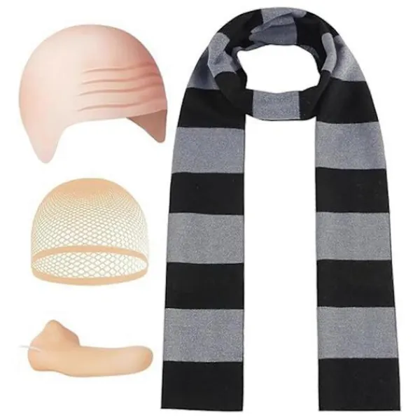 Funktioner: Du får 1 svart och grå randig halsduk, 1 falsk näsa, 1 flintskallig mössa och 1 nätperukmössa.