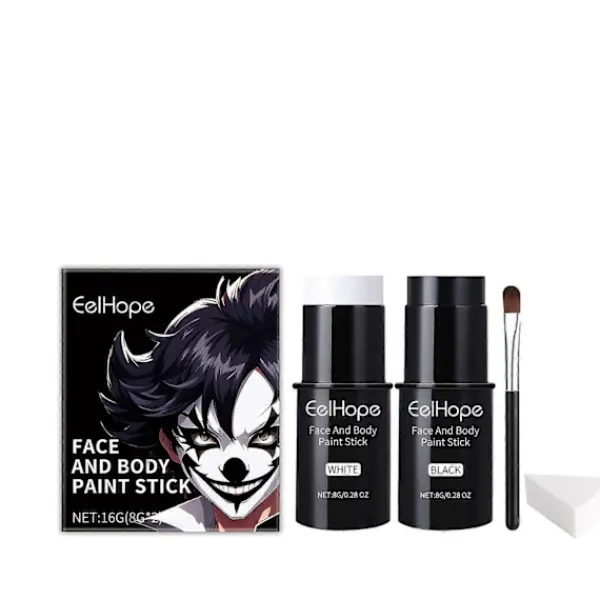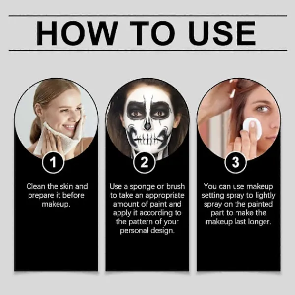 Vårt Halloween ansiktsmålningsstiftset innehåller mineraler och jojobafrö. Det håller huden fräsch och andningsbar och har en mångsidig design som kan användas för ansikts- och kroppsmålning. Sättet att applicera det är enkelt: rengör och förbered huden innan du applicerar smink, ta rätt mängd färg med en svamp eller borste, applicera enligt mönstret i din personliga design, och du kan lätt spraya det målade området med en färgfixeringsspray för att få sminket att hålla längre. Och kan hålla hela dagen, bleknar inte lätt och färgen varar.