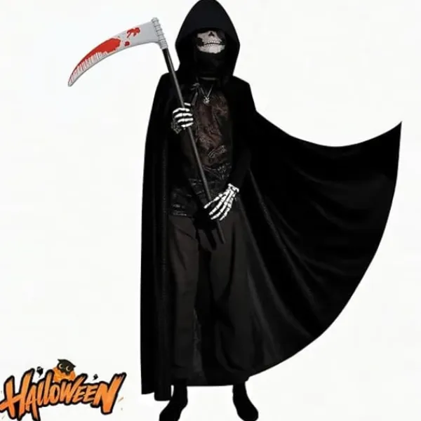 Halloween Liemannen 4-delars komplett set: Bär denna 4-delars Halloween Liemannen kostym för vuxna och gör dig redo för en spännande natt! Setet innehåller en svart sammetsmantel med huva, en realistisk lie, en dödskallemask och ett par dödskallehandskar – allt du behöver för att skapa en spännande förvandling. Halloweenkostymer som passar både män och kvinnor.