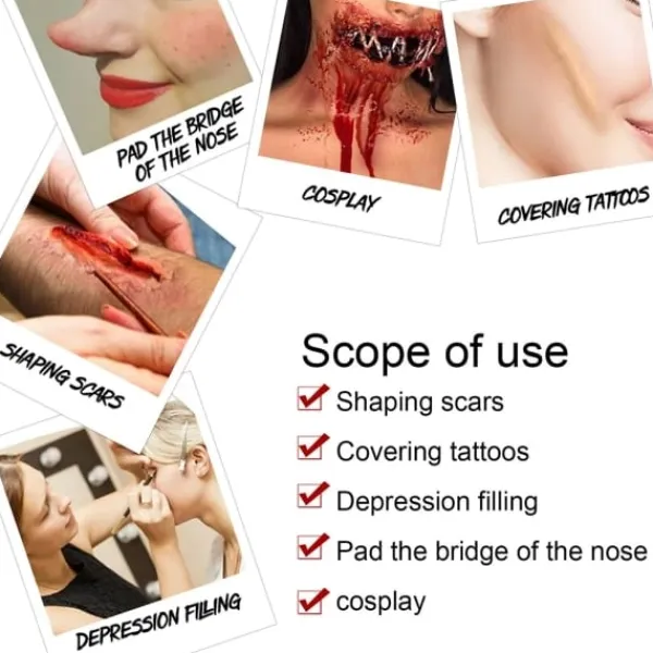 2. LÄTT ATT APPLICERA: Du kan använda vårt sminkvaxkit för läskiga effekter. Enkel sminkborttagning: Skrapa bort vaxet med verktyget och använd sedan sminkborttagningsvatten.