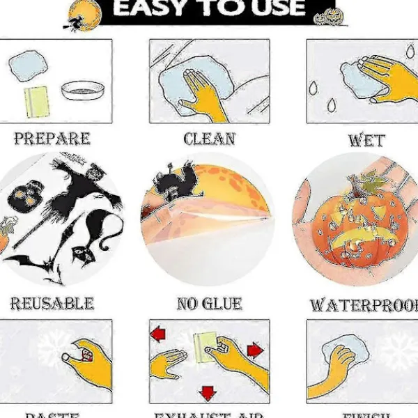 1.Fantastiska Halloweenfönsterdekorationer, ett speciellt tillskott till din fest. 2.Ger mycket roligt till din Halloweenfest. 3.Halloweenfestens fönsterdekor tillför lite skräck och hjälper till att skapa en skrämmande Halloweenatmosfär till dina halloweendekorationer och tillbehör. 4.Halloweenfönsterdekorationer Dekaler Färgerna är ljusa på fönstret, men ser mörka ut på arket. 5.Halloweendekorationen kan återanvändas.
