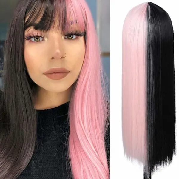 【Prova en ny look】 Peruken med mittbena är gjord av två olika färger, den svarta sidan symboliserar karaktär, den rosa sidan representerar entusiasm. Och du är alltid i fokus när du dyker upp vid vilket tillfälle som helst