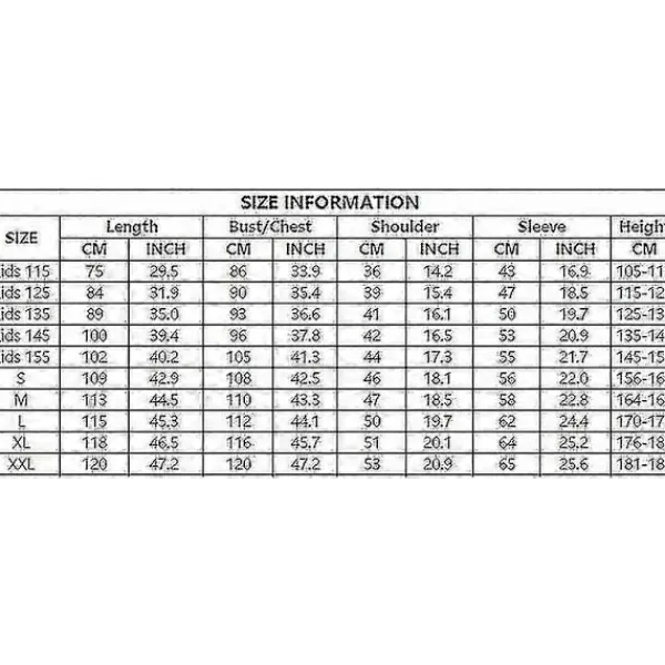 | Size | Aldult L, Aldult M, Aldult S, Aldult XL, Aldult XXL, Child 115, Child 125, Child 135 |