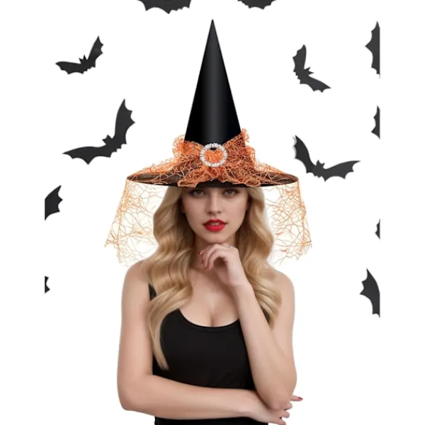 Glittrande: Vår häxhatt har spets och en glittrande strassspänne. Den perfekta kombinationen av häxhatten med delikata spetselement ger den en mystisk och elegant charm. Det svarta nätmaterialet i häxhatten ger den ett spöklikt och mystiskt utseende, vilket gör dig till en mer charmig häxa och lockar till dig andras uppmärksamhet på kostymfesten.