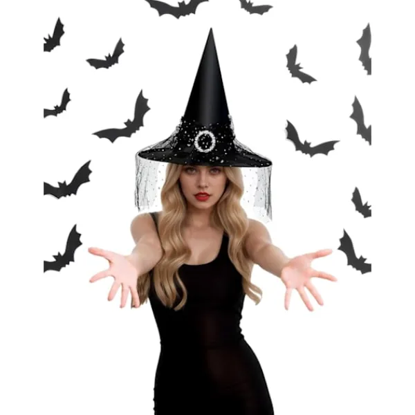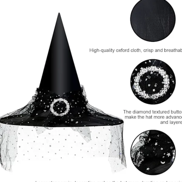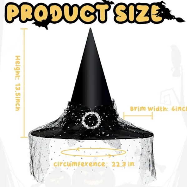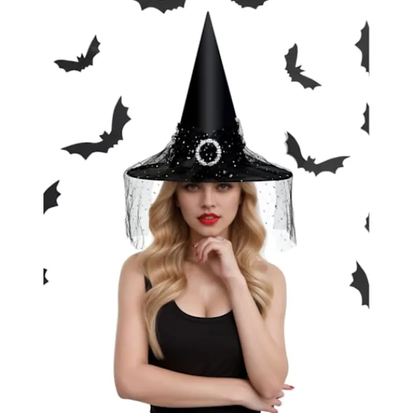 Glittrande: Vår häxhatt har spets och ett glittrande strassspänne. Den perfekta kombinationen av häxhatten med delikata spetselement ger den en mystisk och elegant charm. Det svarta nätmaterialet i häxhatten ger den ett spöklikt och mystiskt utseende, vilket gör dig till en mer charmig häxa och lockar andras uppmärksamhet på kostymfesten. Bekväm att bära: Dessa häxhattar är gjorda av lätt och ventilerande nätmaterial, vilket säkerställer komfort även när de bärs under en längre tid. Det elastiska bandet inuti hatten säkerställer en säker och justerbar passform, så att du kan bära den bekvämt hela natten utan obehag. Det breda brättet ger också gott om skugga och skydd mot sol och regn. Användbart kostymtillbehör: Oavsett om du vill ha en charmig häxlook eller en spöklik häxlook, kommer dessa hattar garanterat att locka uppmärksamhet och är det perfekta tillbehöret för att komplettera din kostym. Den klassiska designen och de mångsidiga färgvalen gör dem lämpliga för en mängd olika kostymer, så att du kan sticka ut på vilken fest som helst. En storlek: Våra häxhattar är designade med en one-size-fits-all-design för att passa de flesta vuxnas huvudomkrets. Det elastiska bandet inuti hatten ger en bekväm passform samtidigt som det säkerställer att hatten sitter ordentligt på plats utan att glida av, vilket hjälper dig att behålla ditt vackra utseende. Lätt att förvara och bära, bekvämt för utomhusaktiviteter eller resor. Bred användning: Dessa häxhattar är inte bara lämpliga för fester, utan också för andra festliga tillfällen som maskeradbaler och rollspel. Du kan använda dem för att blockera UV-strålar, eller så kan du matcha dem med dina kostymer för att till fullo njuta av festens glädje. Dessutom är de också bra presenter till familj och vänner. Det kommer att vara en fantastisk present!