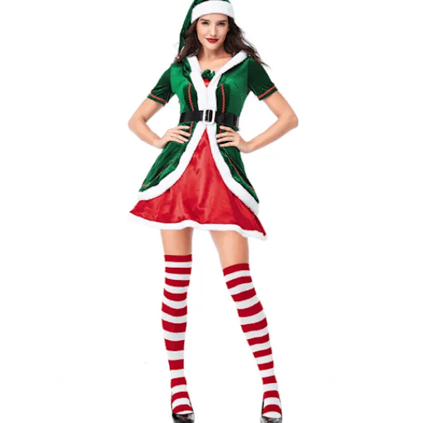 Unik design: Denna elfjulkostymdesign är väldigt unik. För att få dig att sticka ut på julfesten parade vi ihop med rödrandiga strumpor, kjolens färg är klassiskt grön och kjolen är omgiven av stort rött. Den här klänningen kan sägas vara ganska attraktiv och lämplig för dig.