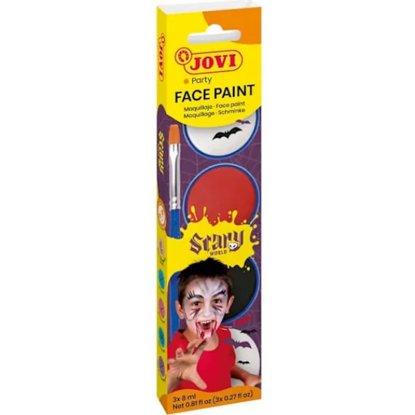 Jovi Scary barnsmink är utformat för pojkar och flickor från 3 år. Detta kit innehåller tre flaskor med 8 ml krämigt smink, tillgängligt i klara färger: vit, röd och svart. Dessa färger kan blandas för att skapa unika effekter. Produkten levereras med en sminksvamp och en platt borste, vilket gör appliceringen lättare. Texturen är behaglig och jämn, vilket garanterar hög täckförmåga. Dermatologiskt testad, är detta smink icke-toxisk och tillverkad i Spanien. Det är fritt från parabener och de vanligaste allergenerna, vilket gör det säkert för alla hudtyper. Flaskformatet möjliggör enkel applicering utan att vatten behövs, och dess oljebaserade formula förhindrar att produkten torkar ut. Idealisk för barnfester, födelsedagar, karnevaler, Halloween och andra festliga evenemang, kan detta smink enkelt rengöras med en fuktig trasa eller med tvål och vatten. Produktens dimensioner är 20 mm i bredd, 58 mm i längd och 235 mm i höjd, med en vikt av 0,08 kg. Observera att produkten innehåller små delar och bör användas under övervakning av en vuxen. Ej lämplig för barn under 36 månader. Spara tillverkarens uppgifter för säker användning.
