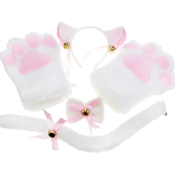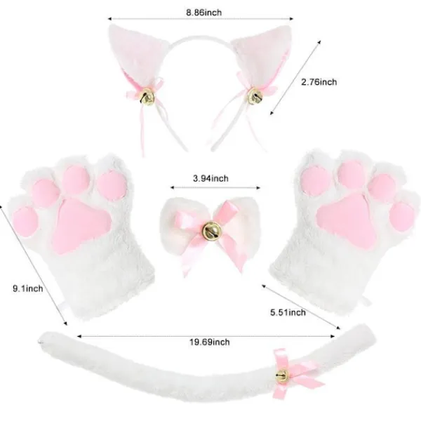 Paketet innehåller: 1 par katt tasshandskar, 1 öronhårklämma och en klocka på varje sida, 1 rosett halsband, 1 kattsvans med en klocka.