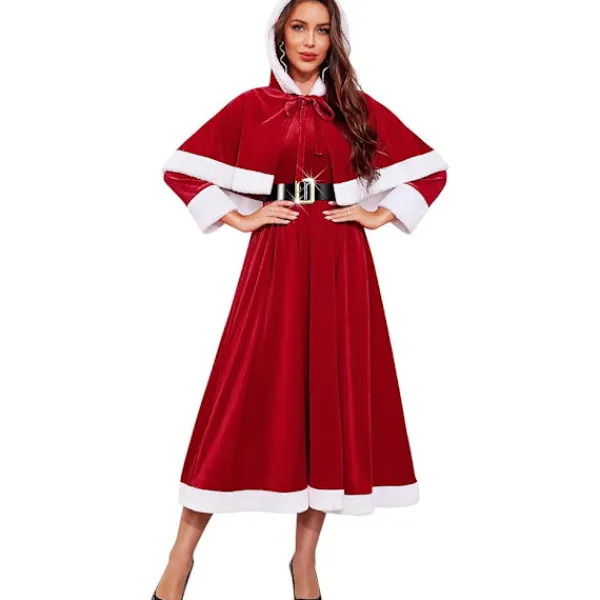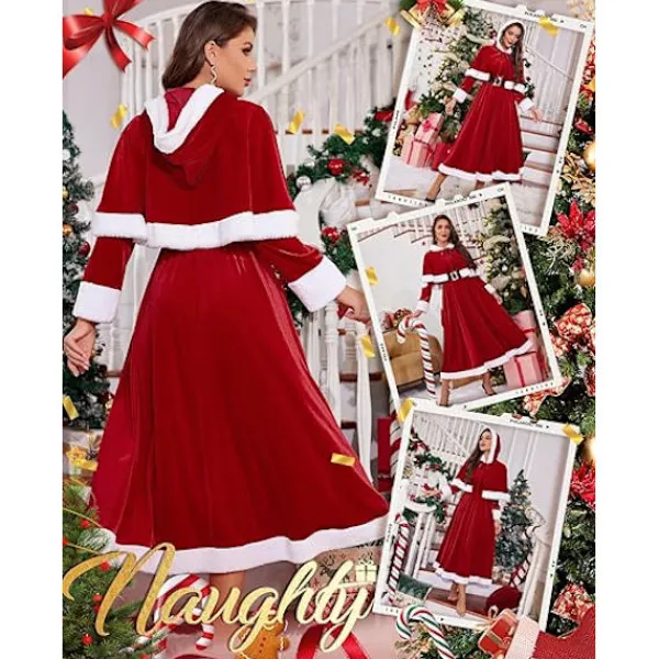 Mångsidig och lämplig för flera tillfällen: Vår tomteklänning för kvinnor är perfekt för julfester, julhelgssammankomster och till och med cosplay-evenemang. Denna mångsidiga julklänning i sammet är designad för en mängd olika julhelgstillfällen. Den är också perfekt för vinterfotografering och gör dig till stjärnan under julhelgen; Bekväm, snygg och lätt att bära: Denna julklänning för kvinnor har en flytande design som är avsedd att ge komfort och rörelsefrihet hela dagen. Oavsett om du är värd för en fest eller deltar i en julparad kommer den att hålla dig snygg och bekväm under hela evenemanget. Du kommer att få en julklänning för kvinnor med en huva och ett bälte.