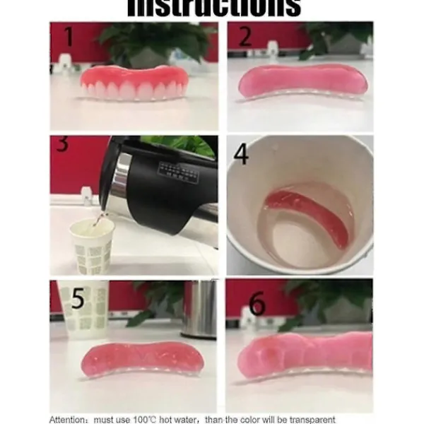3. Lätt att använda och rengöra Blötlägg först silikageltejpen i varmt vatten, använd sedan minipincett för att sätta silikageltejpen i de falska tänderna och sätt de falska tänderna på dina egna tänder och passa. Flytta dem slutligen till din lämpliga plats; Det är mycket bekvämt och lätt att rengöra och är återanvändbart^