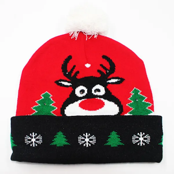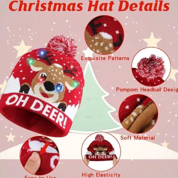 Ny Design – Denna jullysande stickade mössa har en fängslande design som visar upp traditionella motiv som snöflingor, renar och snögubbar. Utsmyckad med blinkande färgade LED-lampor skapar den en drömsk och iögonfallande effekt.