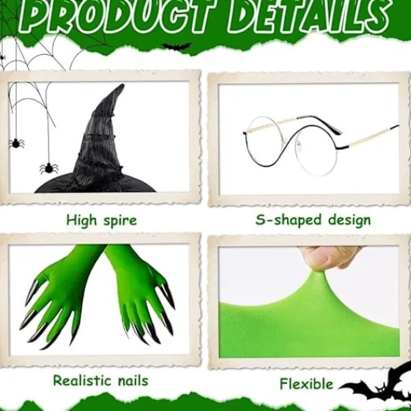 Häxkostymtillbehör: Våra häxkostymtillbehör inkluderar en svart häxhatt, ett par gröna långa klohandskar och ikoniska trollkarlsglasögon, som hjälper dig att skapa en omedelbar distinkt magisk look, perfekt för kostymer och rollspel för kvinnor och flickor