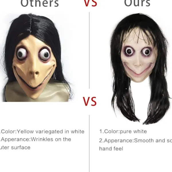 Beskrivning: Skapa din egen unika momo-kostym med denna läskiga momo-mask och flyg genom festen på ett magiskt sätt!