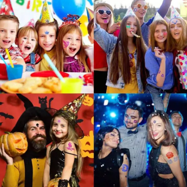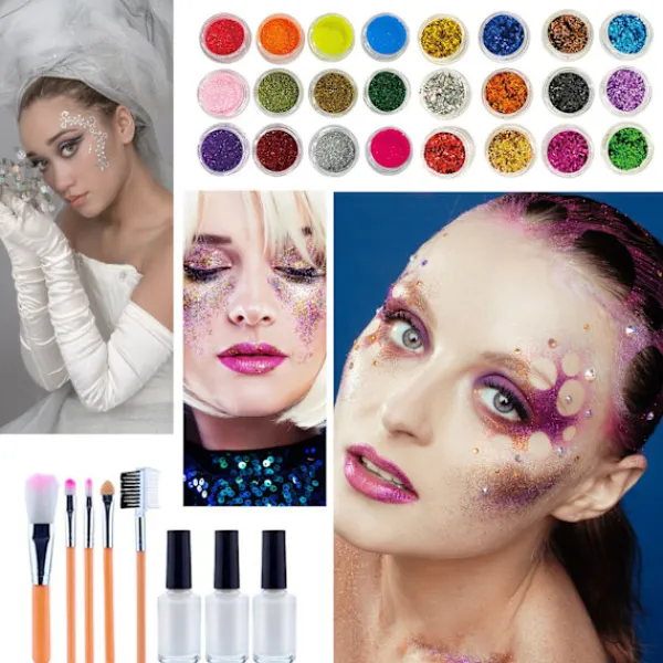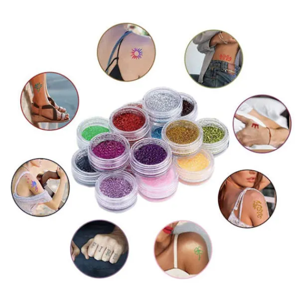 Detta fantastiska glittriga temporära tattoosticker- set kommer i 24 färger, inklusive 6 självlysande puder som lyser i mörkret och får dig att sticka ut från mängden. Vattentät och svettsäker, fastnar på huden och är inte lätt att falla av, mycket slitstark. Du kan använda våra glittertatueringsklistermärken vid många tillfällen för att visa din personlighet för andra.