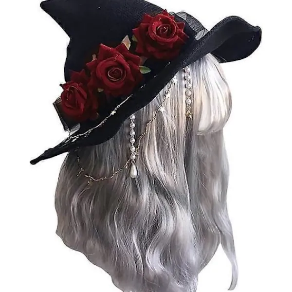 Böjd konformad spetsig halloweenhäxhatt, spökbrudhatt dekorerad med rosblomma, rosett av gasväv, guld stjärnkedja och pärlörhängen, handsydd, söt och vacker, ger ett mystiskt, dramatiskt och drömmande utseende, lek från lolita från den svarta romanen