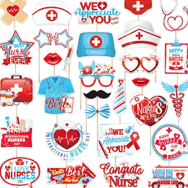 Paketet innehåller 30 stycken sjuksköterska fotobås rekvisita med olika designer, 30 runda träpinnar och 30 limprickar.