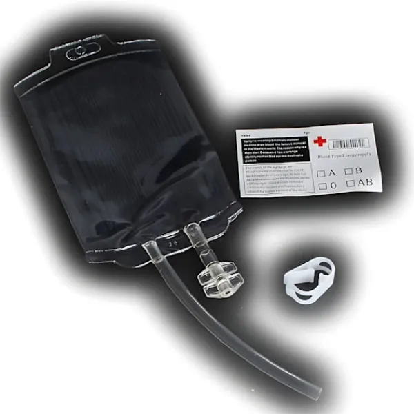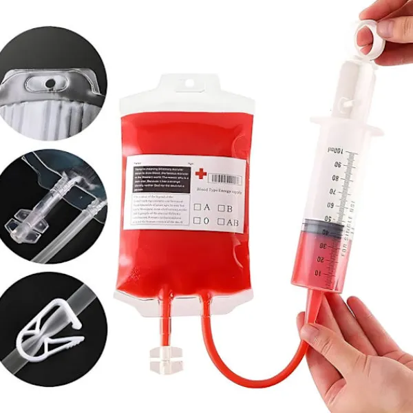 - Skapa en skrämmande atmosfär med vår blodpåse som rekvisita eller som alternativ till glaset.
