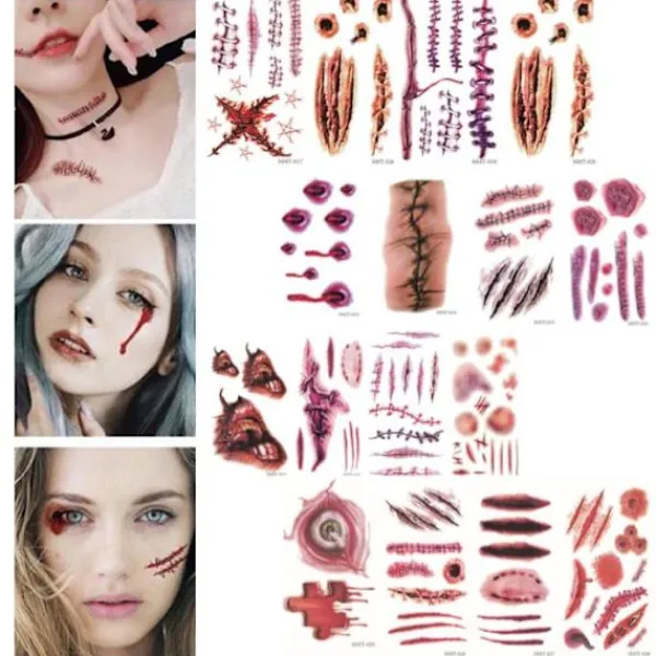 - Skapa en skräckinjagande look med dessa otäcka engångstatueringar – blodiga sår och rivsår för den perfekta hemska stilen.