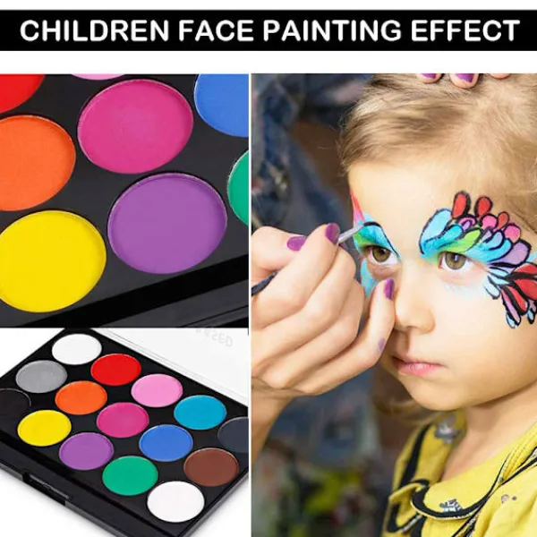 1.【Ett perfekt set】– Det finns 15 färgglada ansikts- och kroppsfärger, 32 återanvändbara schabloner och 2 professionella målarpenslar i paletten som fritt kan blandas för att skapa livfulla effekter.