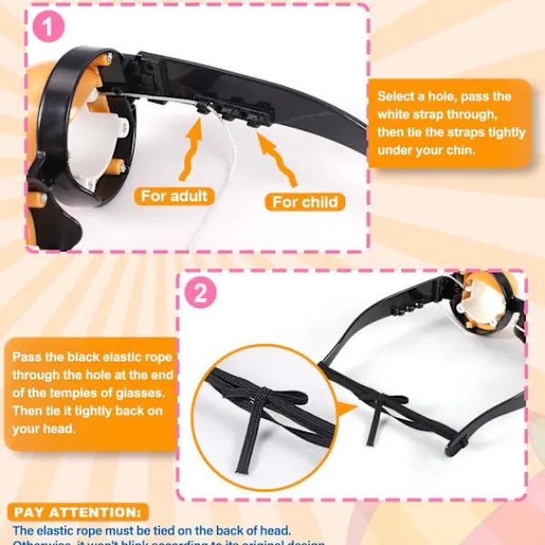 【Hur man Justerar de 2 Banden】Steg 1: Det finns 3 justerbara hål på glasögonens tinningar. Välj ett hål baserat på din ansiktsform, dra det genom det med det vita bandet och knyt sedan de vita banden hårt under hakan; Steg 2: Trä det svarta repet genom hålet i slutet av glasögonens tinningar. Var uppmärksam på korrekt buntning, som visas i figuren. Steg 3: Se till att de två banden är bundna hårt, skratta och le, och de roliga nyhetsglasögonen kommer att blinka.