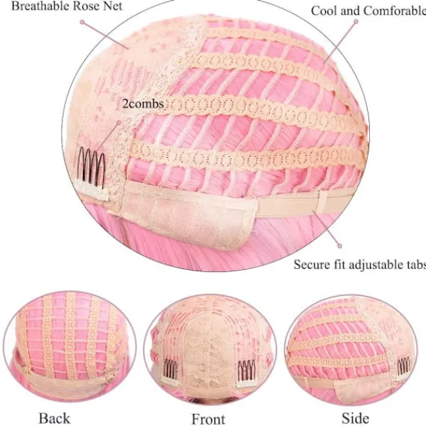 【Perukmössa】Den rosa peruken är 35 cm. Den justerbara remmen gör den lämplig för de flesta och lättare att bära.