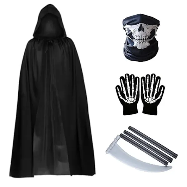 Svart cape-set (inklusive handskar + mask + lie) (rea, supervärde!), komplett set utan ytterligare matchning, hög grad av stylingåterställning, lämplig för Halloween, rollspel, temafester och andra scener. Högkvalitativt tyg är skarpt och stilrent, lien har en realistisk textur och den är bekväm att bära utan att begränsa rörelsen.
