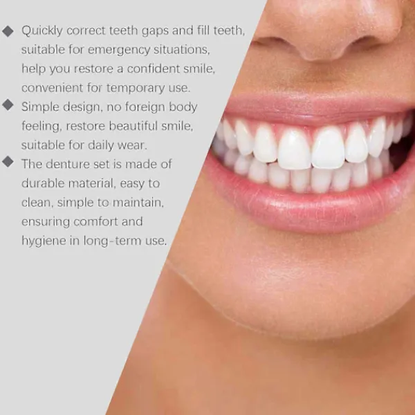 [Anpassningsbart DIY Tandprotes-kit]: Återställ ditt leende snabbt med vårt lättanvända DIY-tandprotes-kit för hemmabruk. Tillverkat av premiumharts, låter detta kit dig anpassa och fullända dina tandproteser för en bekväm, naturlig passform. [Komplett Materialkit för Tandproteser]: Allt du behöver för att skapa anpassade tandproteser hemma ingår i detta omfattande kit. Perfekt för män och kvinnor, det är designat för användning med formgips för att reparera saknade eller ofullkomliga tänder. Skapa dina egna partiella tandproteser och njut av ett självsäkert, naturligt utseende. [Bekvämt och Lättanvänt Tandprotes-kit]: Att skapa dina egna tandproteser eller partiella tandproteser har aldrig varit enklare. Detta kit är perfekt för att ersätta saknade tänder och är lämpligt för både män och kvinnor, inklusive de som letar efter ”dientes postizos para mujer”. Det erbjuder en enkel och effektiv lösning för att återställa ditt leende. [Omtänksam Gåva till Nära och Kära]: Ge bort ett naturligt leende med vårt DIY-tandprotes-kit. Perfekt för vänner och nära och kära, detta kit ger en enkel lösning för falska tänder och partiella tandproteser. Hjälp dem att enkelt återfå sitt självförtroende och uppnå ett vackert, anpassat leende samtidigt som de njuter av den personliga hantverksupplevelsen. [Uppnå den Perfekta Passformen med Tålamod]: Detta DIY-tandprotes-kit låter dig ta dig tid att uppnå den perfekta passformen. Återanvändbara material gör att du kan göra justeringar tills du är nöjd med resultatet. Det är idealiskt för män, kvinnor och alla som behöver partiella tandproteser eller löständer, och erbjuder en anpassad lösning för tandersättning.