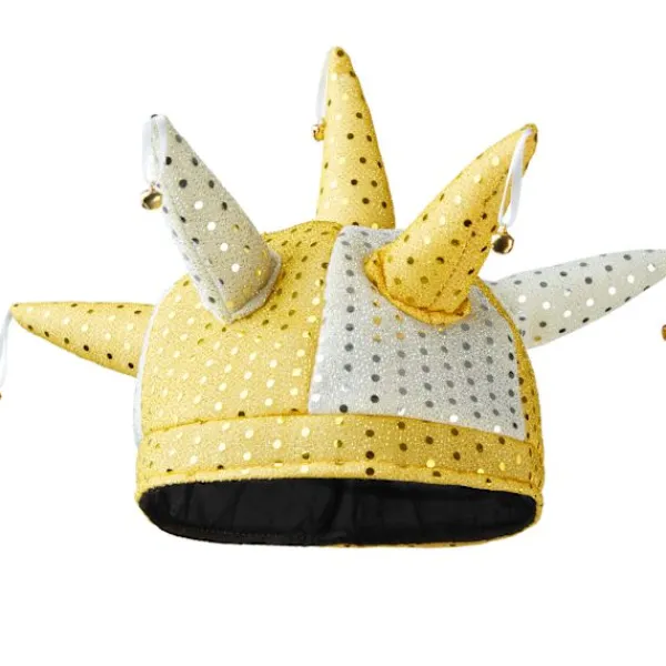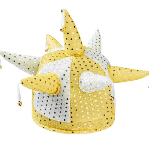 Gycklarhatten med bjällror känner man igen på långt håll tack vare ljudet. Med färgerna vitt och guld, många glittrande prickar och sju horn är den dessutom ett blickfång. Med narrhatten med bjällror går det galet och klangfullt till på alla fester.